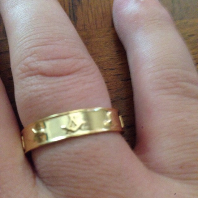 My new ring, bronze plated with gold. The working tools are around the band. From shape ways a 3d printing company.